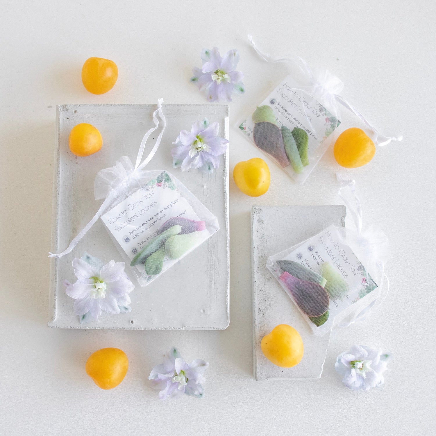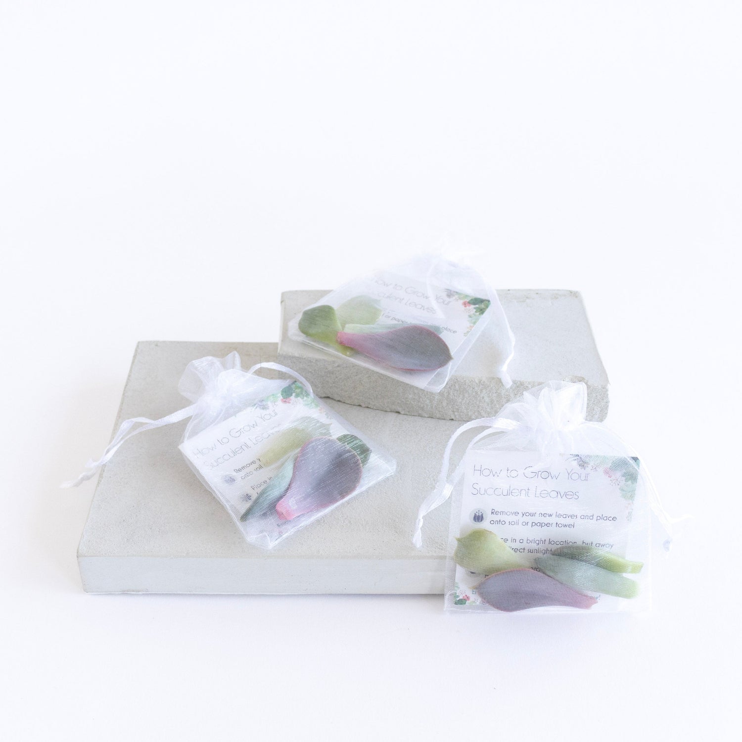 These beautiful kits include 4-5 ready-to-grow succulent leaves in a petite 3 x 4 inch white organza bag, and accompanied by detailed instructions.